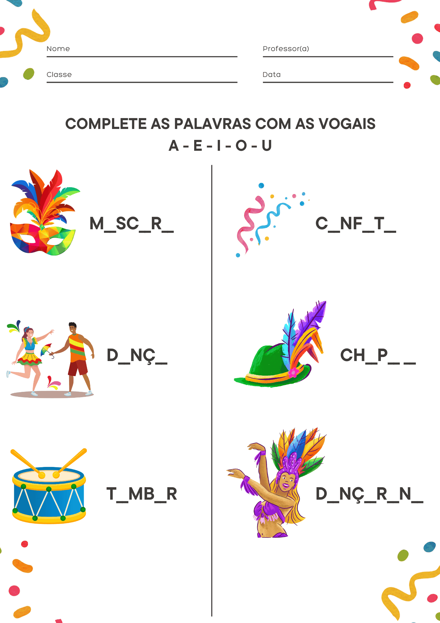 Atividades temáticas como esta ajudam a tornar o processo de alfabetização mais atrativo e próximo da realidade dos alunos. Ao trabalhar o Carnaval por meio do completar palavras, o professor consegue reforçar conteúdos essenciais da língua escrita de forma lúdica, respeitando o nível de desenvolvimento do 2º e 3º ano. A atividade pode ser utilizada como reforço, revisão ou proposta complementar, contribuindo para um aprendizado mais prazeroso e significativo.