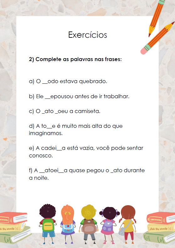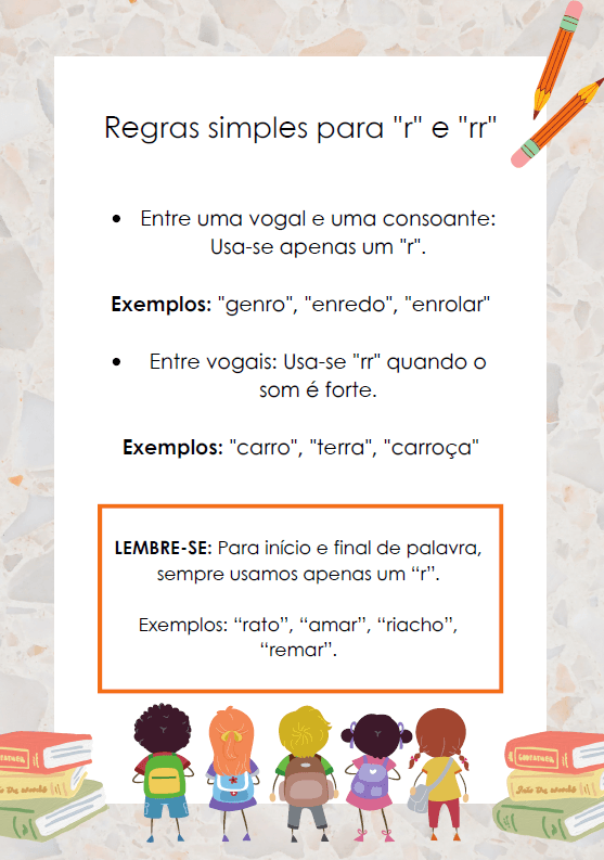 Essas atividades são ótimas para reforçar a importância do uso correto das palavras com “R” e “RR”, proporcionando aos alunos um momento de reflexão e prática da ortografia. Incentive os alunos a observar essas palavras no dia a dia, seja na leitura de livros, seja em diálogos, reforçando o aprendizado de forma contínua.