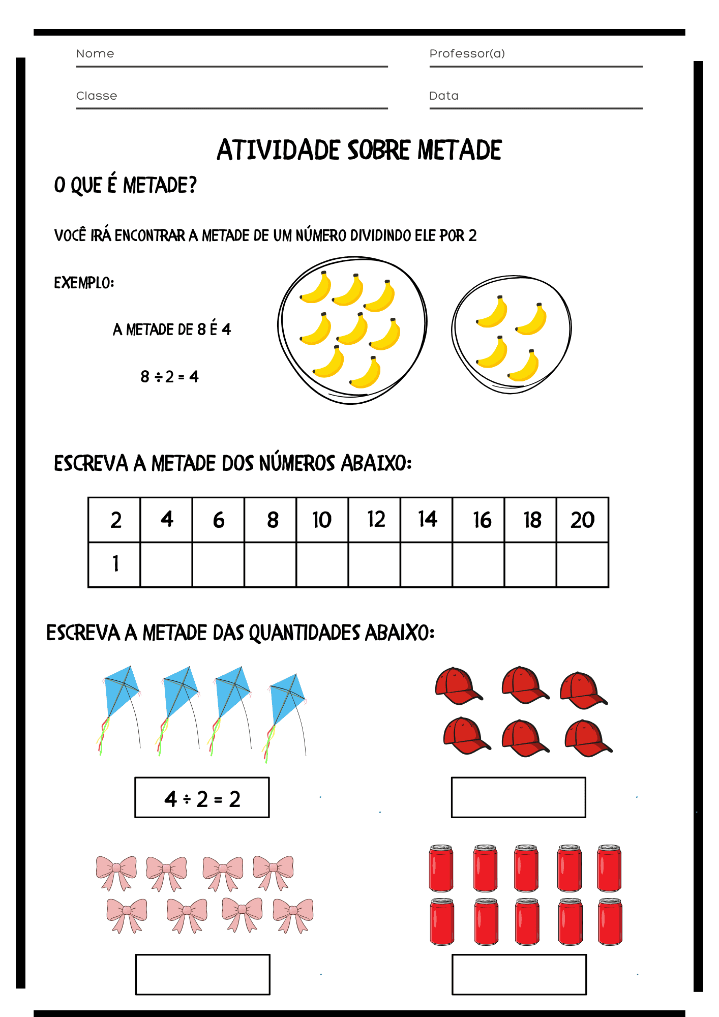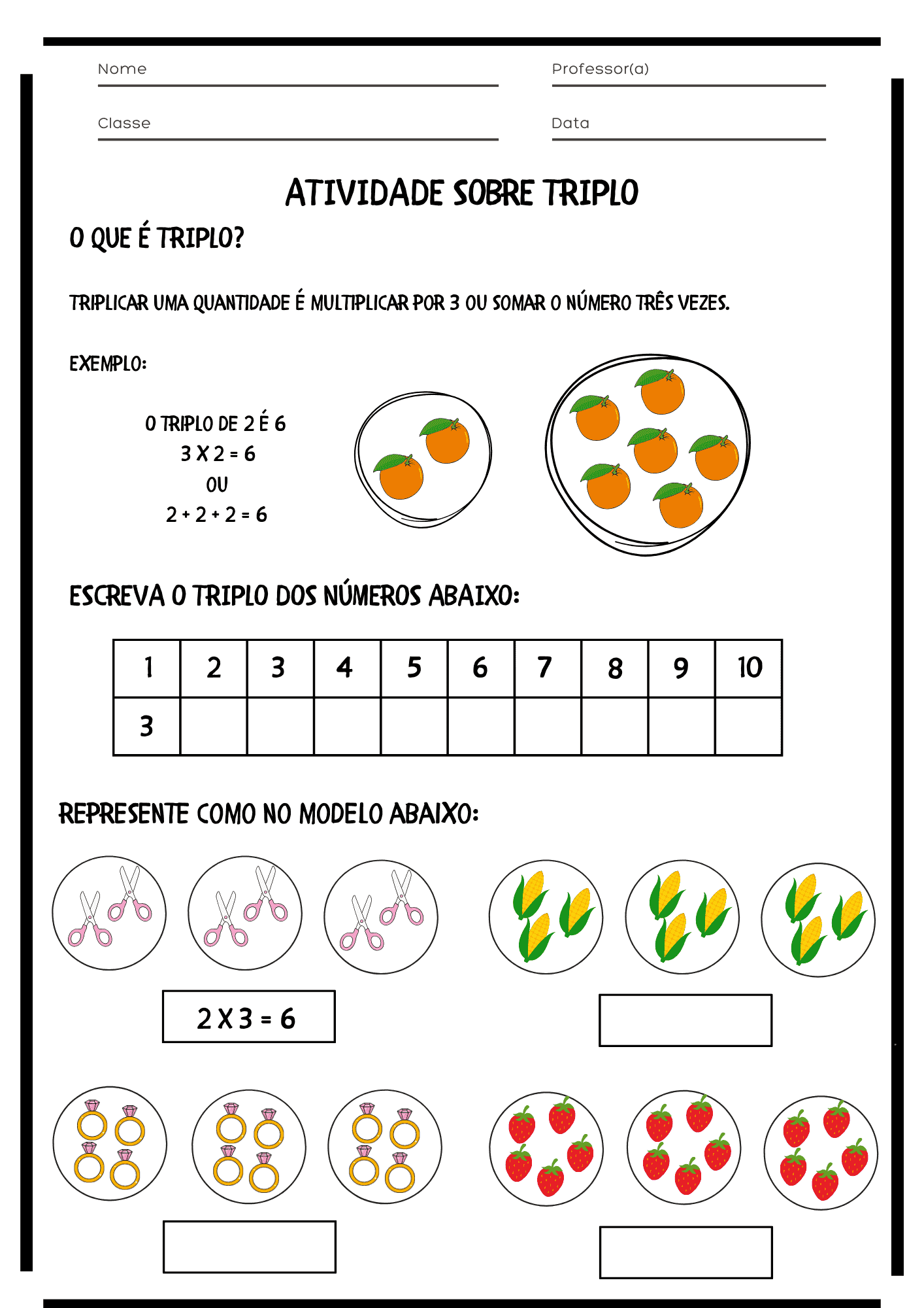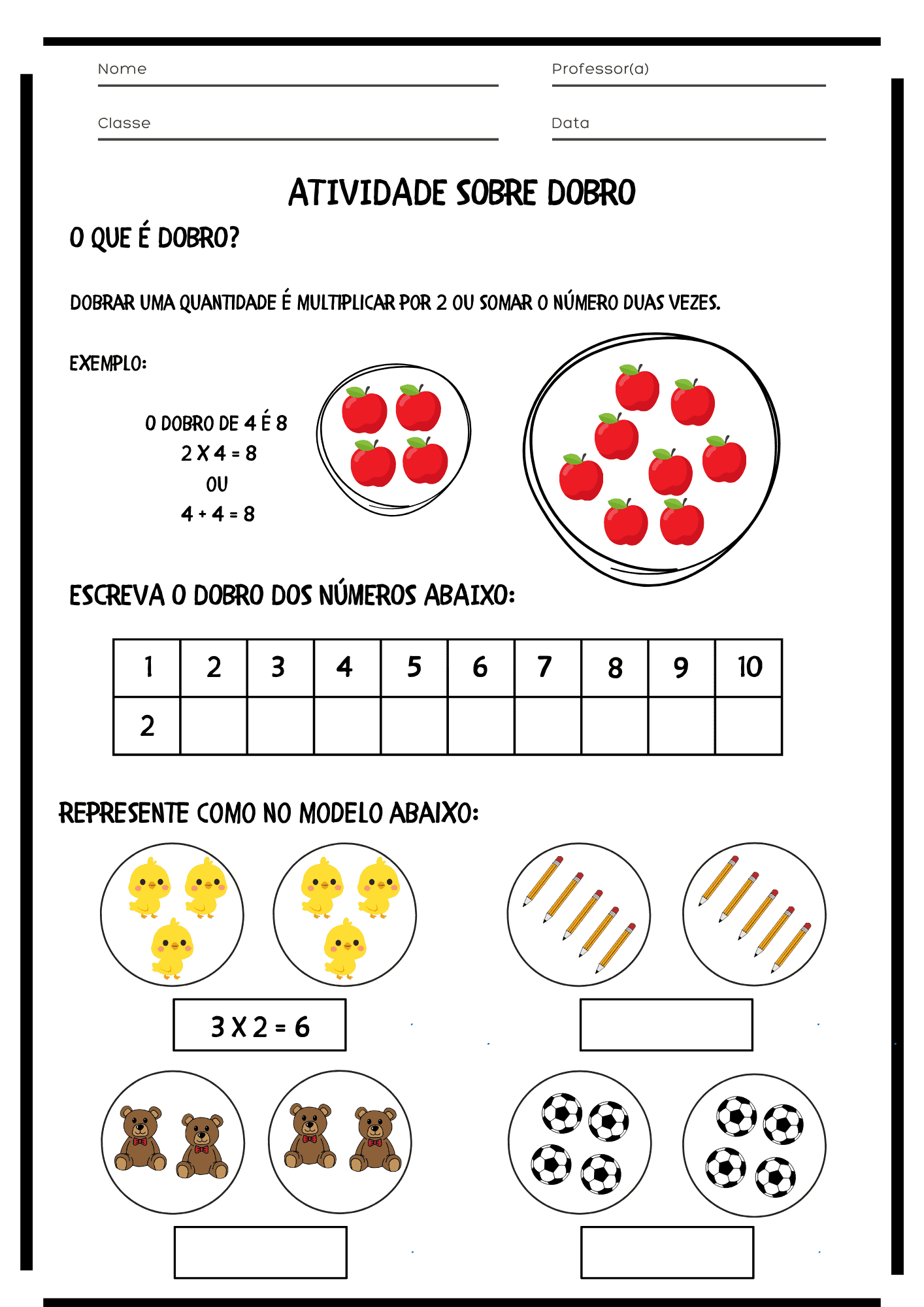 Nesta atividade, os estudantes terão a oportunidade de identificar, calcular e representar o dobro, o triplo e a metade de diferentes quantidades, utilizando situações simples, problemas contextualizados e propostas visuais. O objetivo é fortalecer a compreensão dessas relações numéricas de forma prática e acessível, favorecendo a consolidação das bases da multiplicação e da divisão.