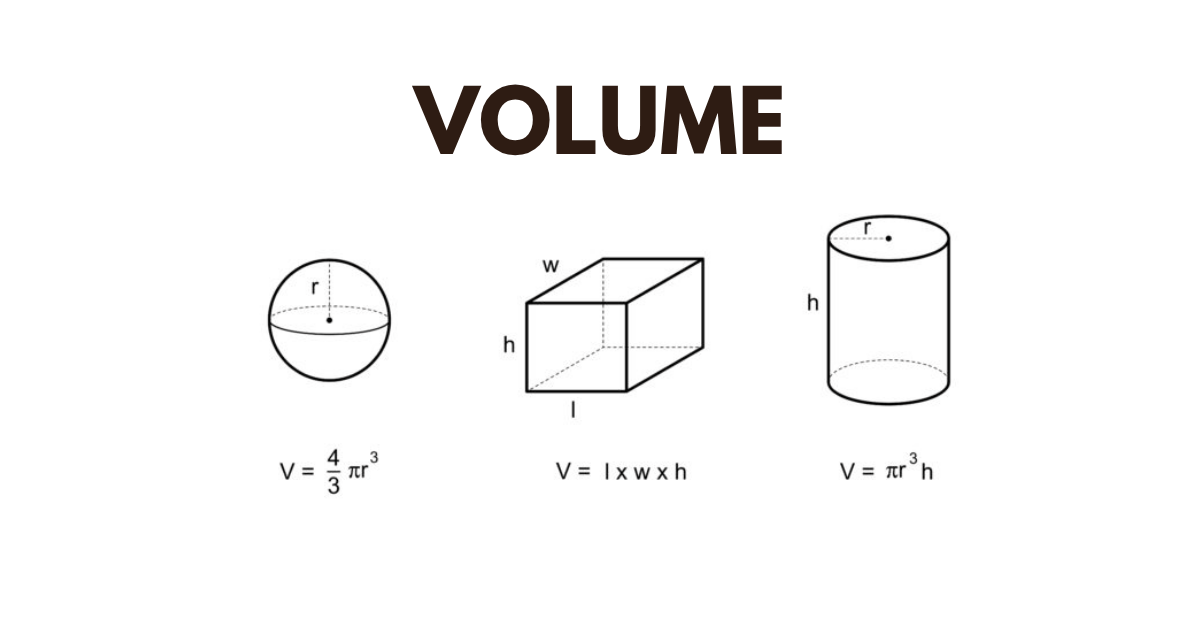 Volume é a medida do espaço ocupado por um objeto. A unidade padrão é o metro cúbico (m³), mas também usamos o centímetro cúbico (cm³) e o litro (L). Abaixo temos a fóruma de volume da esfera, do retângulo e do cilindro: